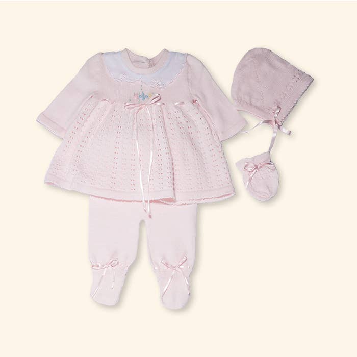 Welcome your little one home in our Lulwa NB Take me Home Set! This adorable knitted ensemble features a cozy bonnet to keep tiny heads warm and cute mittens to protect those precious little fingers. Perfect for making baby's first journey extra special!