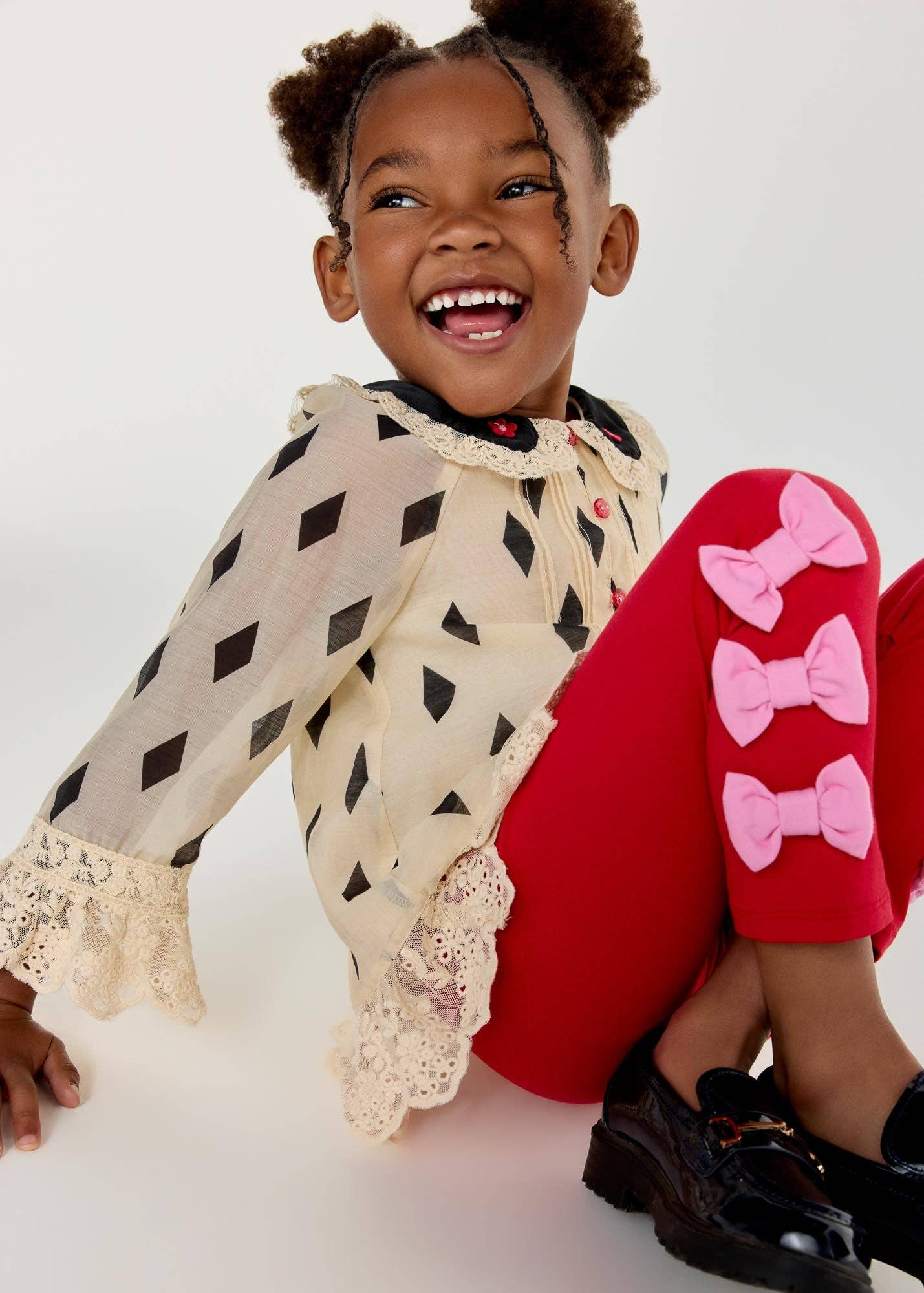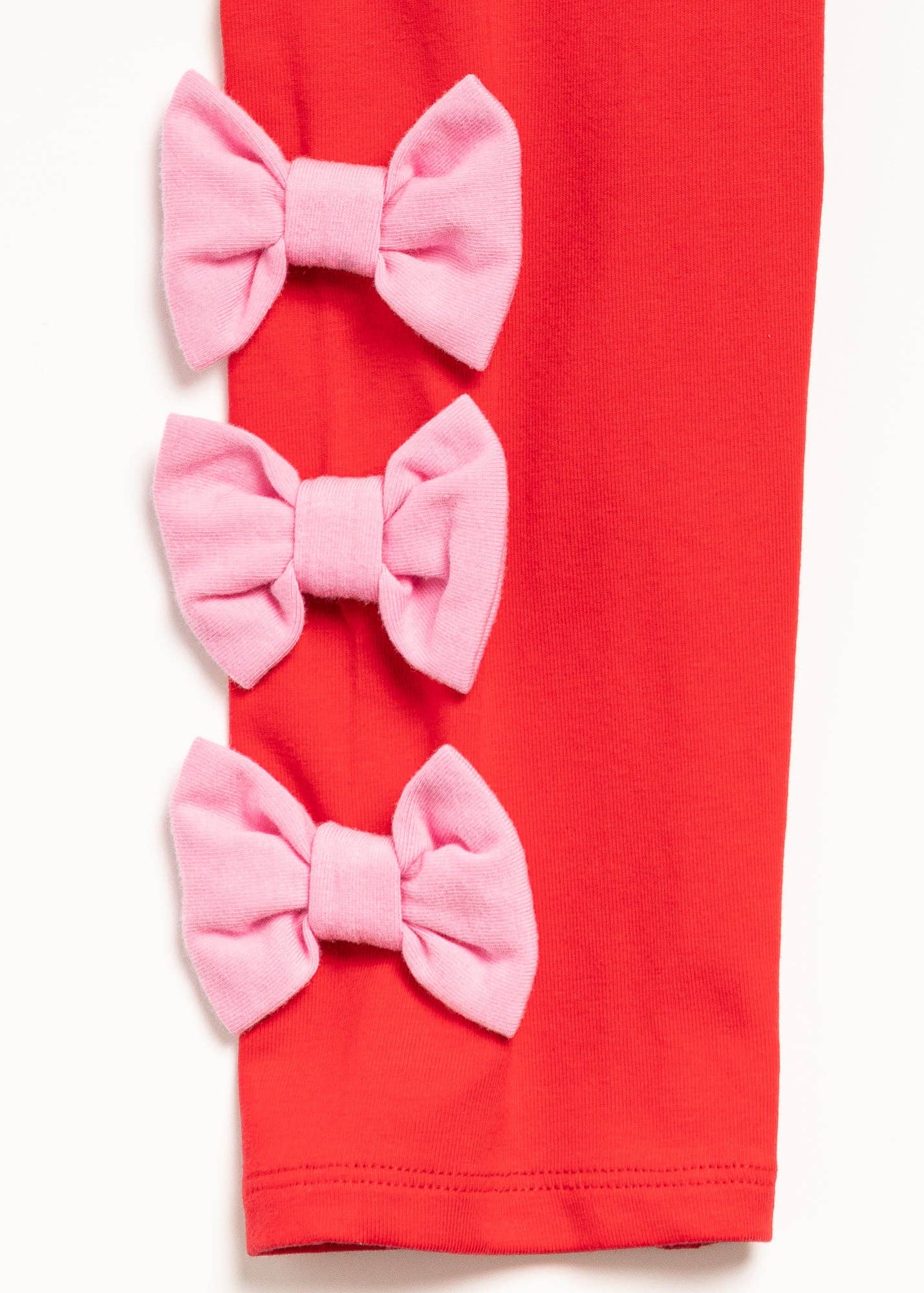 The rich Tango Red of the Red Carpet Leggings makes these jersey knit bottoms a staple for your girl to sparkle and shine! They’re finished with sweet pink bows at the sides for extra flair.
