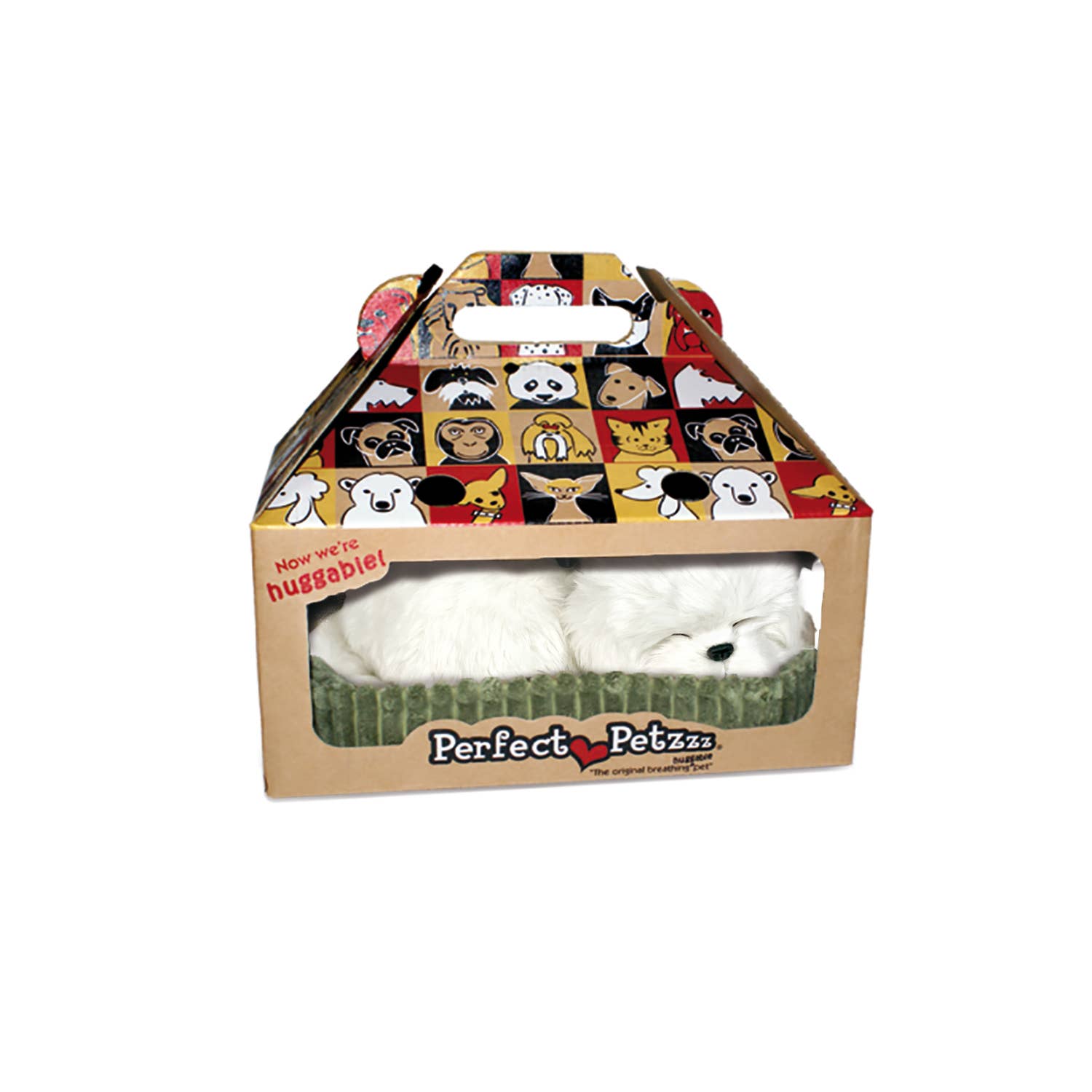 The Maltese is small in size but big in personality, it exhibits all the traits of the fun toy breeds and it makes a feisty but loving companion. Each bundle includes: + new pet. + collar with a pet tag. + new plush pet bed. + brush + adoption certificate. + 1 'D' alkaline battery. + 100% synthetic fur. Dimensions: + carrier box (flat): 11x7.75x5" (with the tent up: 11x7.75x9"). + bed: 13x10x2". + petzzz: 9.5x7x3".