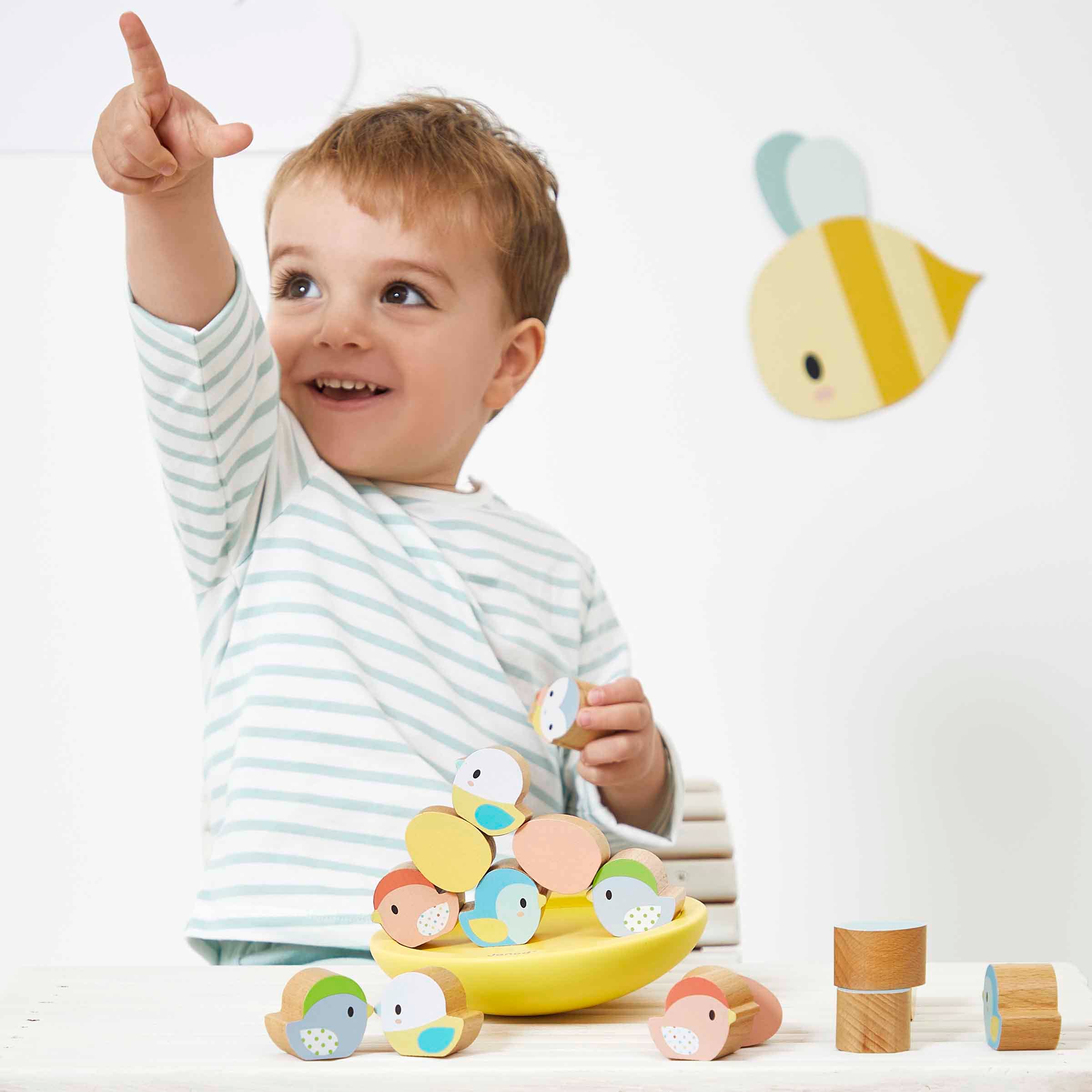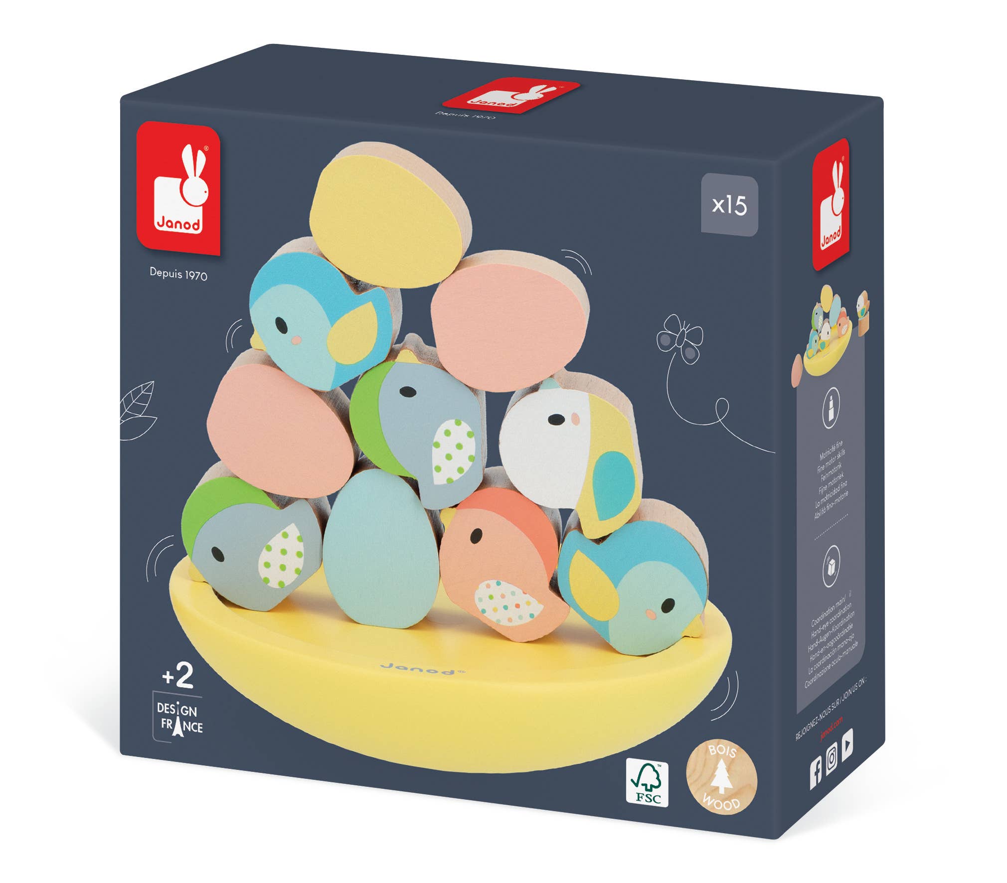 1 egg, 2 eggs, 3 birds, etc... The aim: Fit as many pieces as possible on top of the nest! But be careful, the nest itself is balancing so if the pieces aren’t evenly arranged, then everything will tip over! The ideal toy for developing your child’s fine motor skills and hand-eye coordination. This game of skill includes a nest, 9 birds and 6 eggs; all of which are made of wood. Toy for children aged 2 and up.
